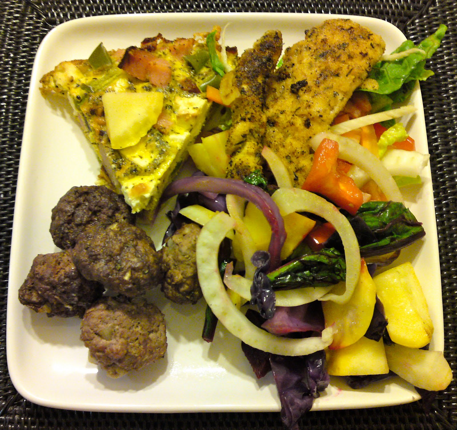 I make these constantly, in muffin form for picnics, and in pie size for dinners. And yet my usual technique is oddly missing from my blog! There's my Quiche, with its almond flour crust, and my really meaty Kanga & Bacon Frittata, but my diced-stuff-with-egg-poured-on-it-baked-in-oven has yet to feature! Until now...
